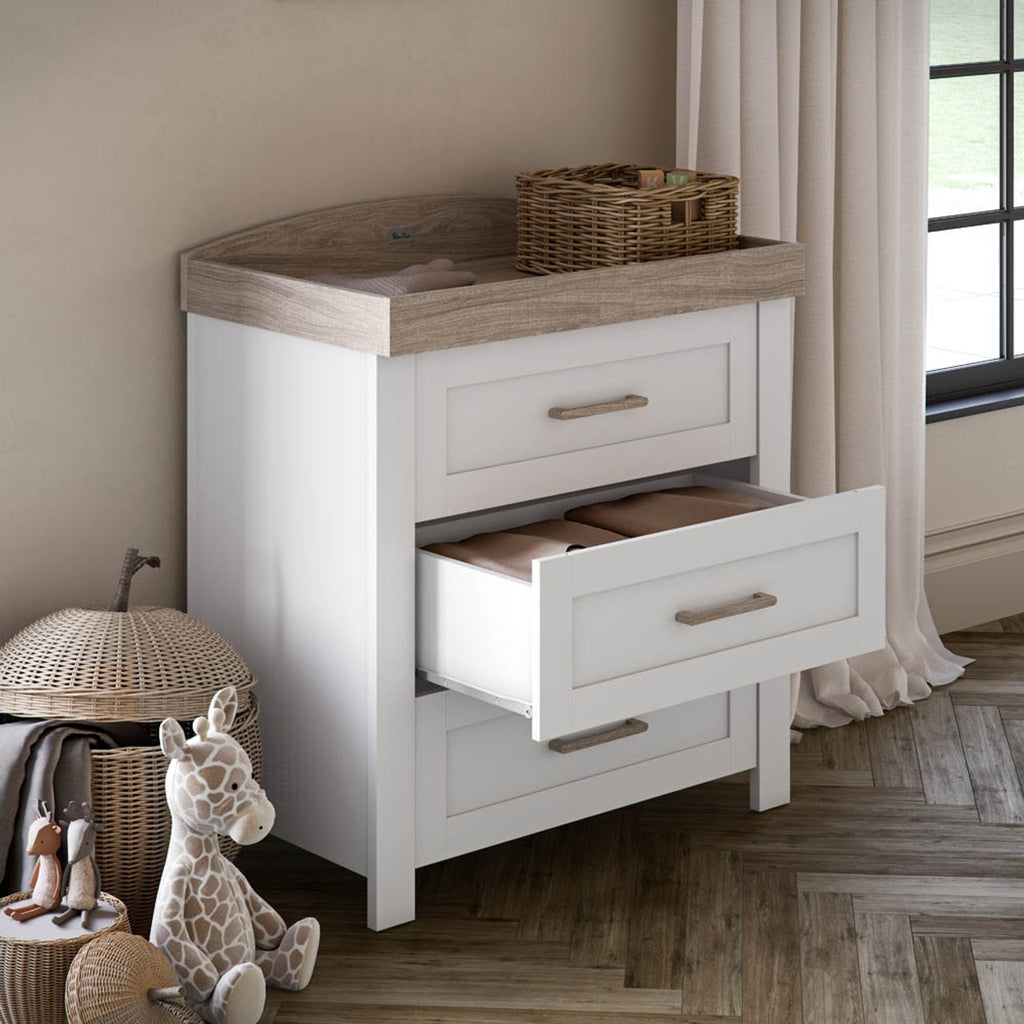 Keep your nursery organised in Valencia’s spacious three-drawer dresser, with plenty of room for clothing and bedding. For nappy and outfit changes, attach the changer top to your dresser or, when no longer needed, use as an arts and crafts tray or extra storage basket.