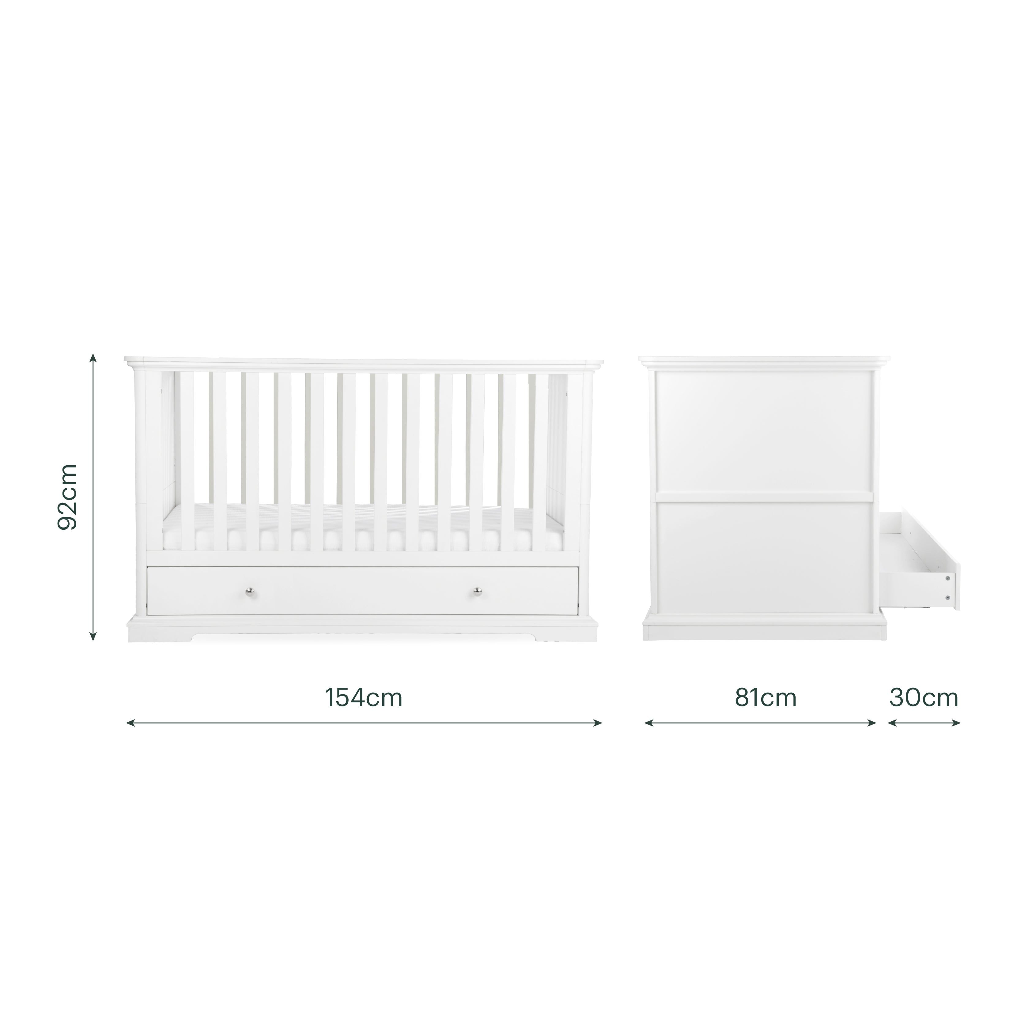 The CuddleCo Beaumont Grand 2 Piece Nursery Furniture Set combines statement design with thoughtful, family-focused features. At its centre is the Beaumont Cot Bed, featuring period inspired design details, integrated soft close drawer and adjustable mattress base positions that convert into a toddler bed as your child grows.