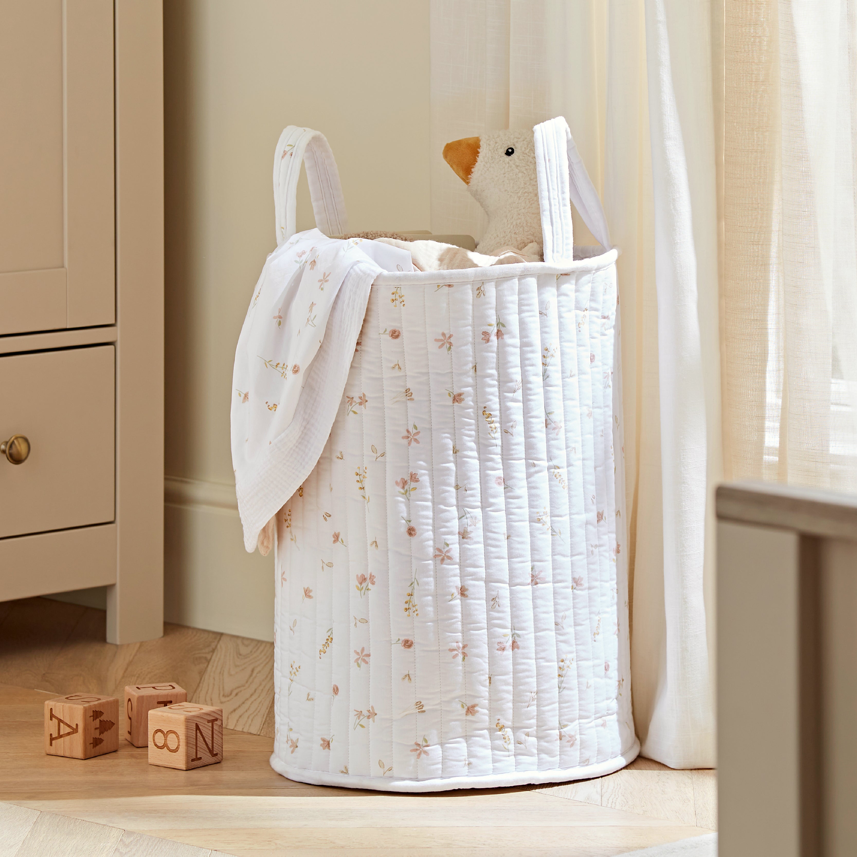 Soft, spacious and made to fit beautifully into your home. Our large quilted storage basket is ideal for keeping clothes, blankets or toys tucked neatly away. With a soft-sided, flexible structure, it’s easy to move around and safe to use in any nursery or bedroom. The warm floral print adds a gentle, decorative finish that works with both modern and traditional interiors. With their stylish design and washable material, these baskets offer both practicality and elegance.