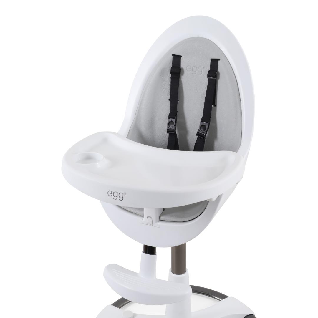 Suitable for babies from 6 to 36 months (up to 15kg), the egg® Highchair includes a soft, wipe-clean EVA seat pad, a 5-point magnetic harness, a 3-position meal tray with cup holder, and with a dishwasher-safe top tray.