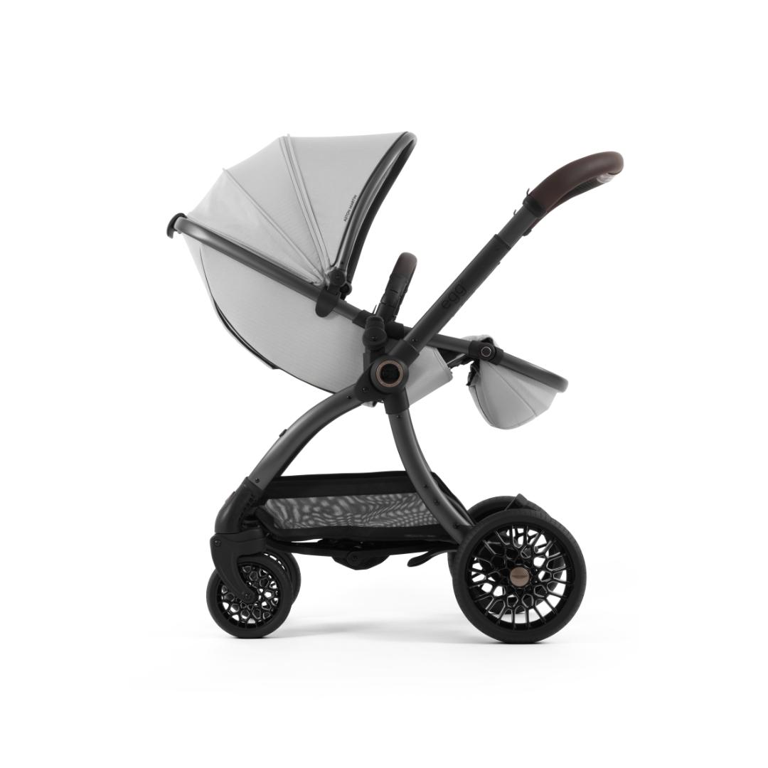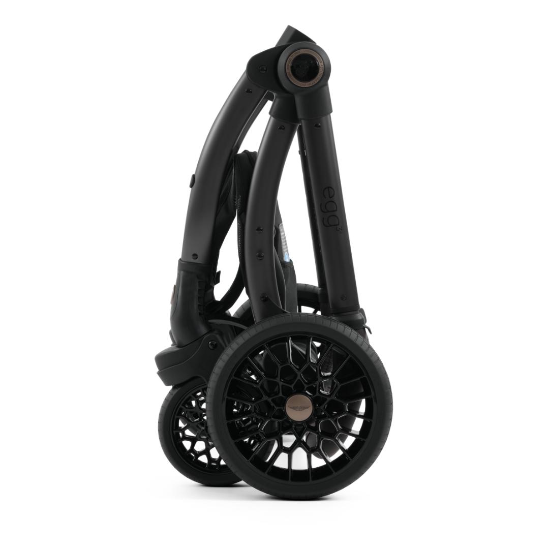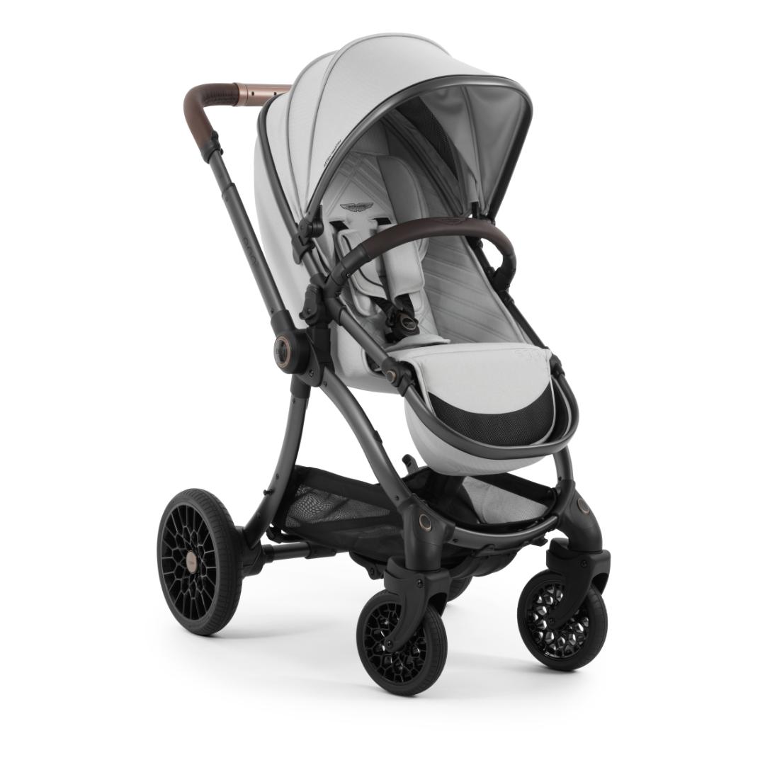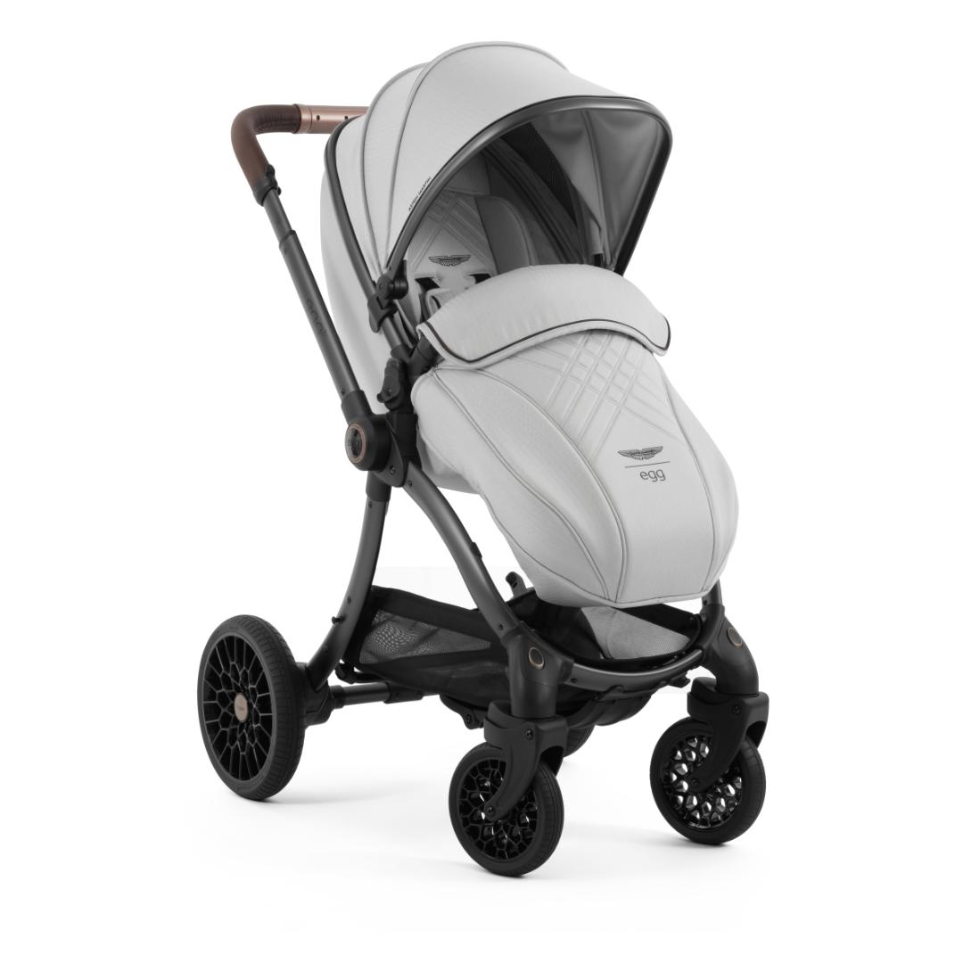 The matte gunmetal chassis of the Soft Grey Aston Martin egg3® Stroller is anchored by a reimagined Magneto Bronze-rimmed knurled central hub, echoing the rotary controls of Aston Martin interiors for a touch of automotive precision. It pairs effortlessly with honeycomb wheels inspired by the Aston Martin Valour and Victor models, while the Tru-Ride® technology delivers smooth, silent, confident handling on every journey. Instant gratification. All-round suspension, swivel or lockable front wheels, and a generous basket ensure everyday practicality.