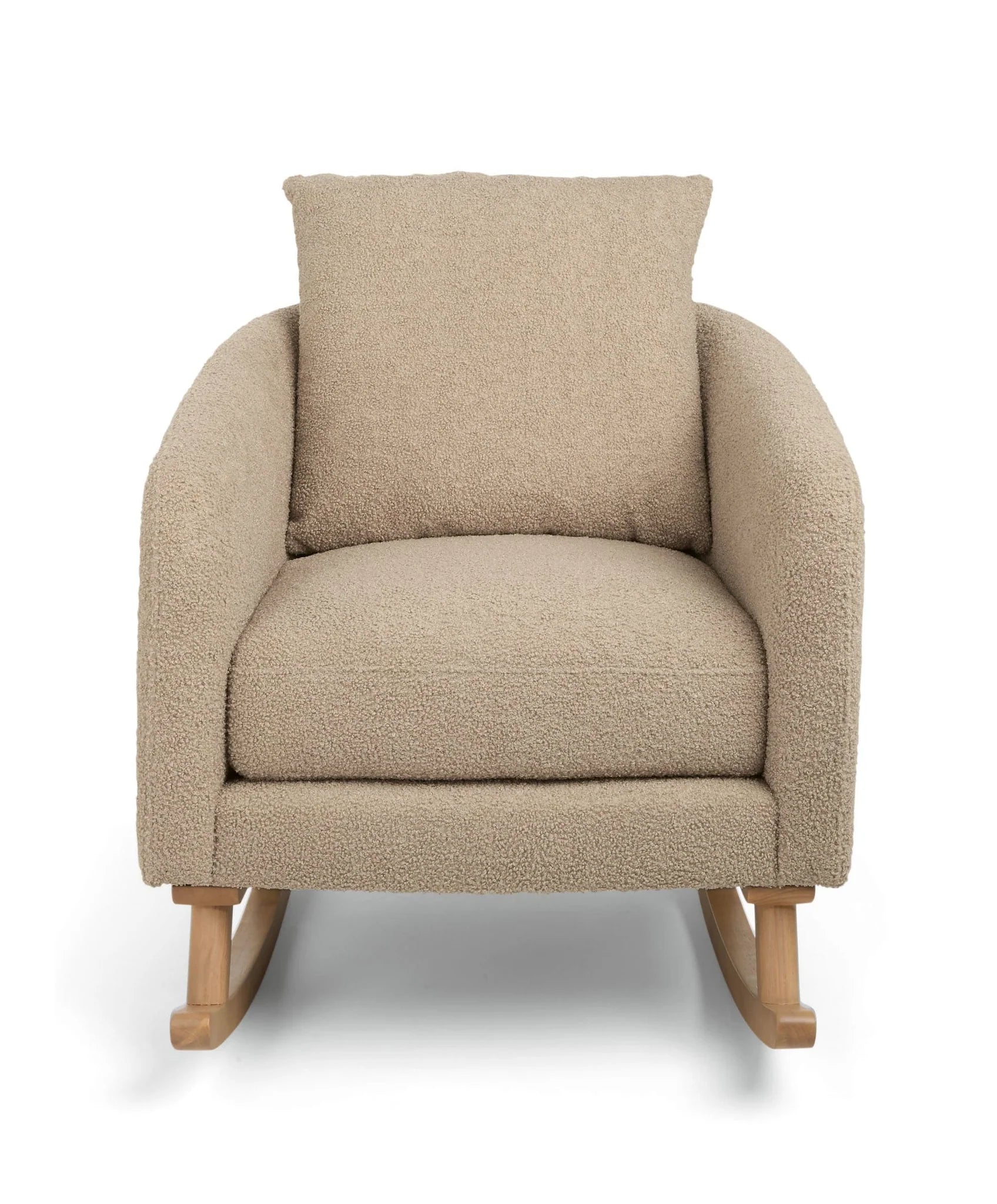 Discover a nursing chair that comforts, supports and cocoons both you and your little one with our Alma rocking nursing chair and footstool. Crafted from ultra-soft fawn boucle fabric, its smooth, rounded shape and plush, removable cushion provide cosy comfort, while its supportive armrests sit at the perfect height for feeding and cradling. The solid wood rocker offers a gentle, soothing motion and a natural finish, complementing Alma’s contemporary design for a nursing chair stylish enough to stay in your home long beyond the baby stage.