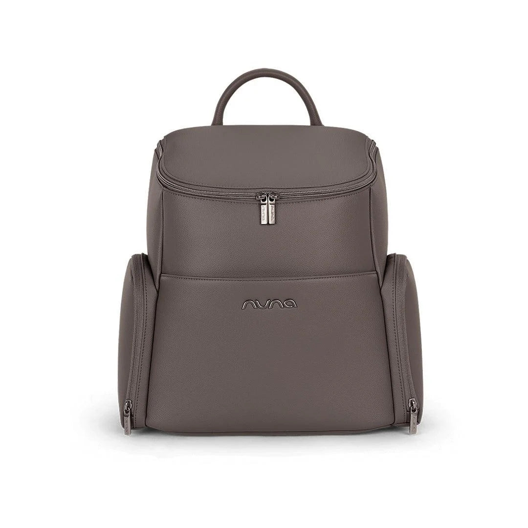 The Nuna Essential Bag in Thunder is a leatherette backpack with multiple pockets, a laptop compartment, changing pad clutch and toiletry pouch. It's a great everyday option for stylish parenting on-the-go.