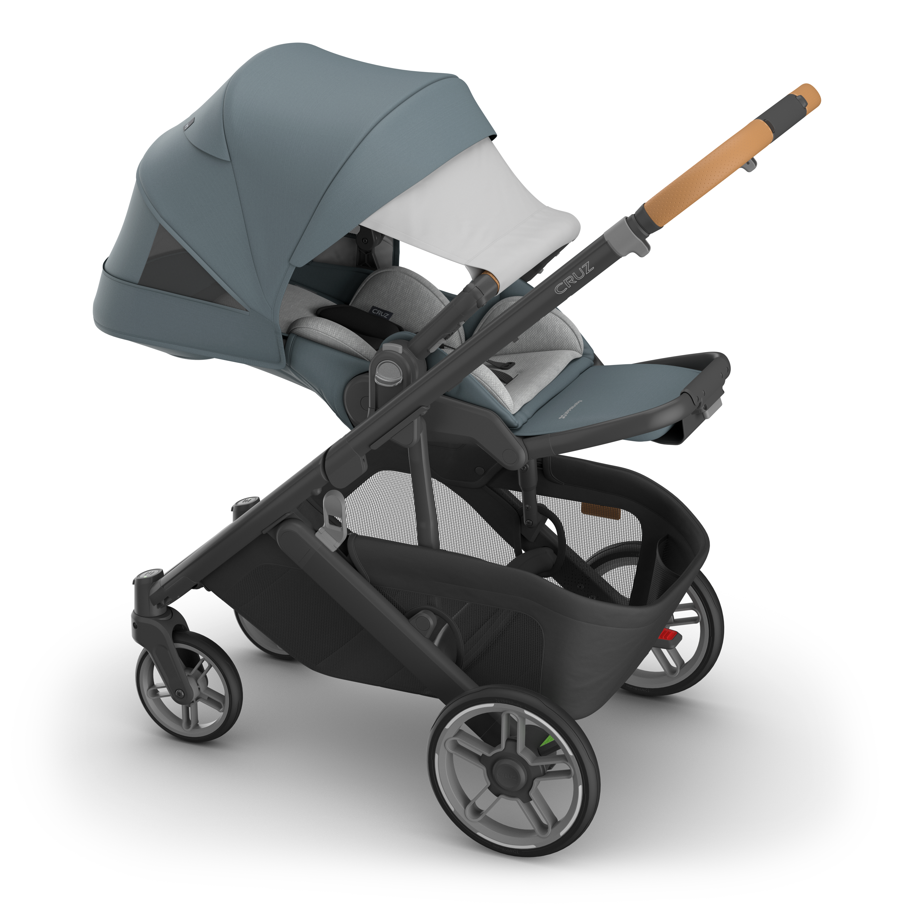 The Uppababy CRUZ V3 boasts a sleek, lightweight chassis paired with all-terrain, puncture-proof wheels and FlexRide shock absorbers, delivering an effortlessly smooth ride. For added safety, the updated rear wheel rims and front forks now feature reflective accents to improve visibility in low-light conditions.
