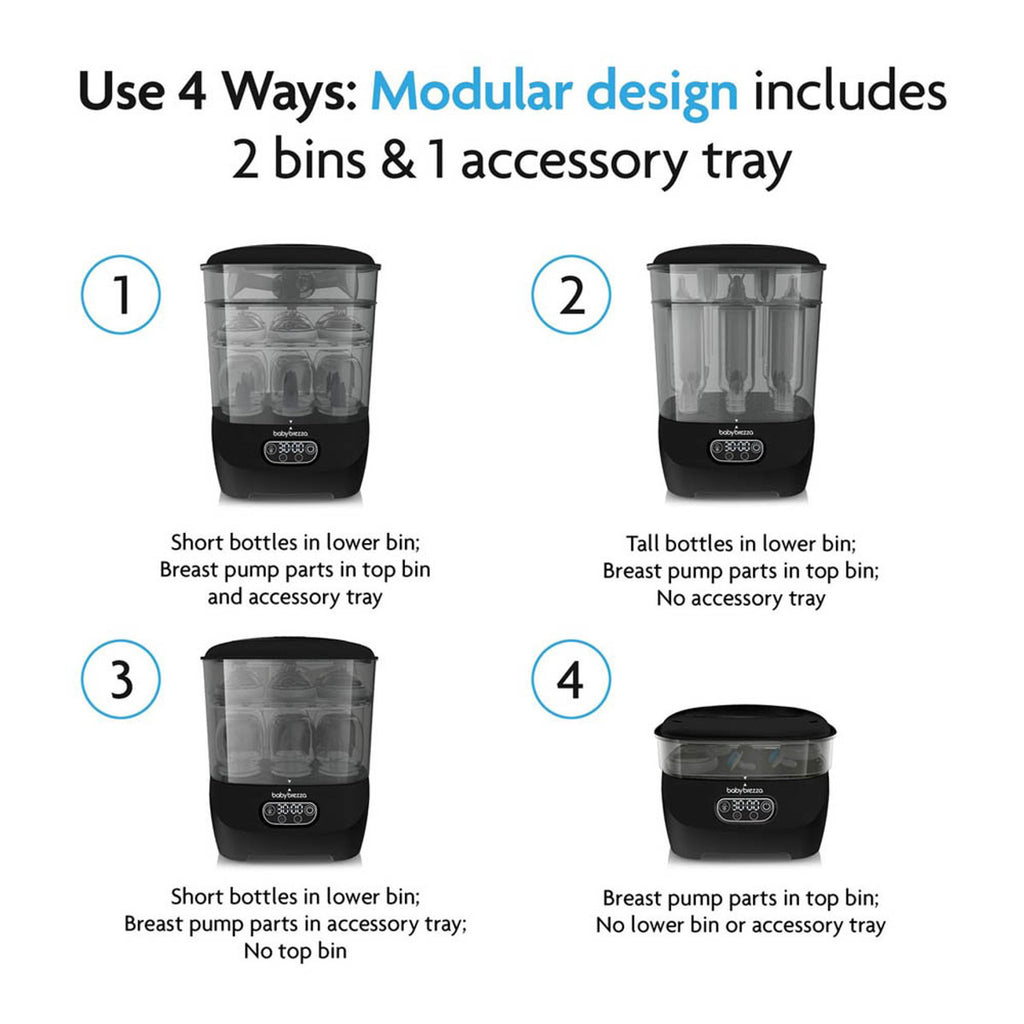 Whether you are looking for a baby bottle steriliser or sanitiser, Baby Brezza’s One Step™ Baby Bottle Steriliser and Dryer Advanced is for you! Our steriliser dryer is the most advanced way to sterilise and dry all brands of baby bottles, pump parts, accessories, and more! This new advanced model comes with a larger bottle rack capacity, allowing you to sterilise and dry up to 8 baby bottles and 2 full pump part sets fast! Automatically sterilise baby products with the touch of a button to kill 99.9% of germs, and dry them 33% faster with HEPA filter technology. Use as a baby bottle steriliser only, dryer only, steriliser and dryer, or as a storage rack. Our Steriliser Dryer Advanced is BPA Free, with a stainless steel heating plate to protect against rust and hard water buildup. This model also includes and easy-to-use LCD control panel to select your preferred function.