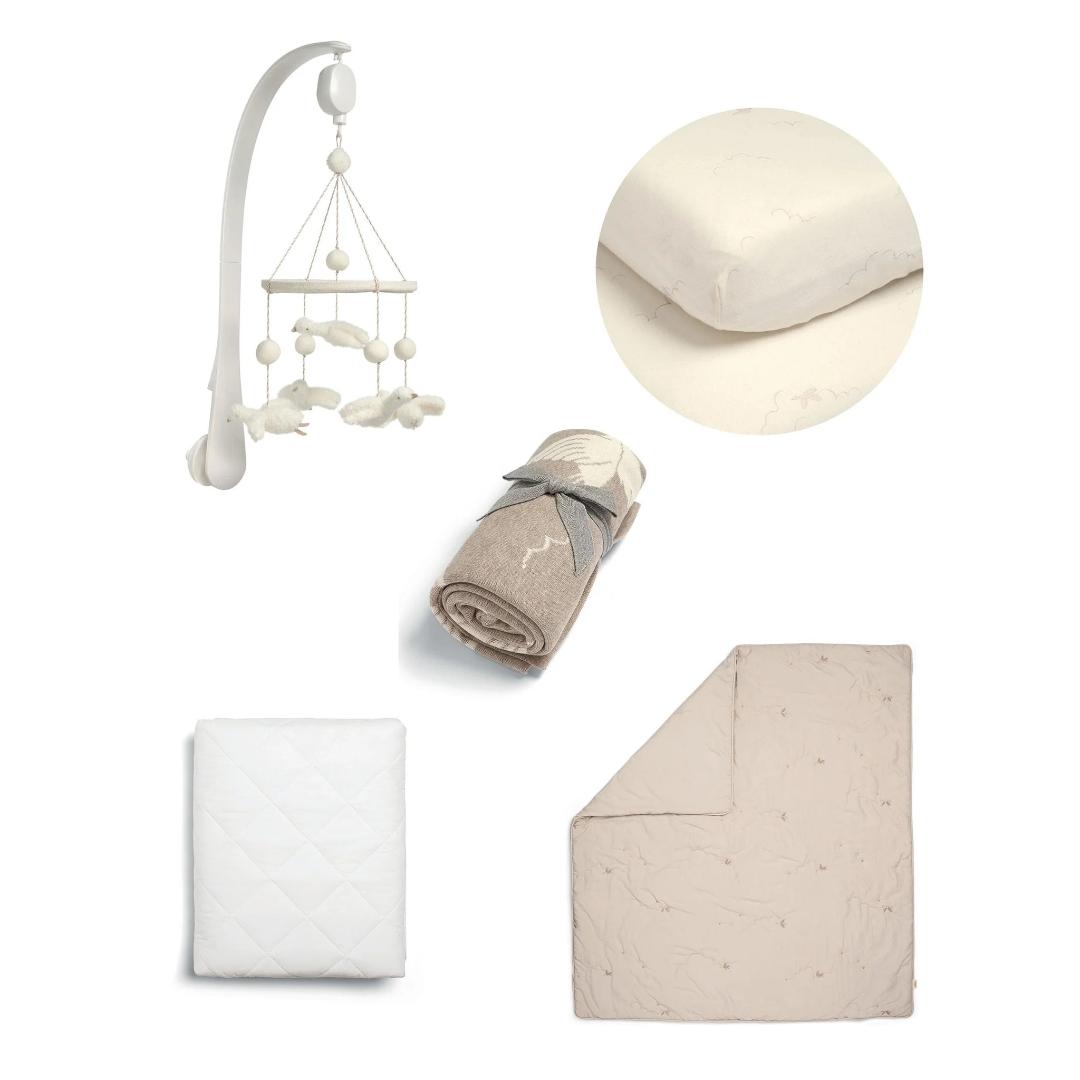 This bundle includes: Welcome to the World Duckling 4.0 Tog Quilt - Soft Taupe, Duckling Musical Mobile, Cotbed Fitted Sheets (2 pack) Welcome to the World Duckling, Welcome to the World Duckling Knitted Blanket - Mocha & Anti-Allergy Quilted Cotbed Mattress Protector.