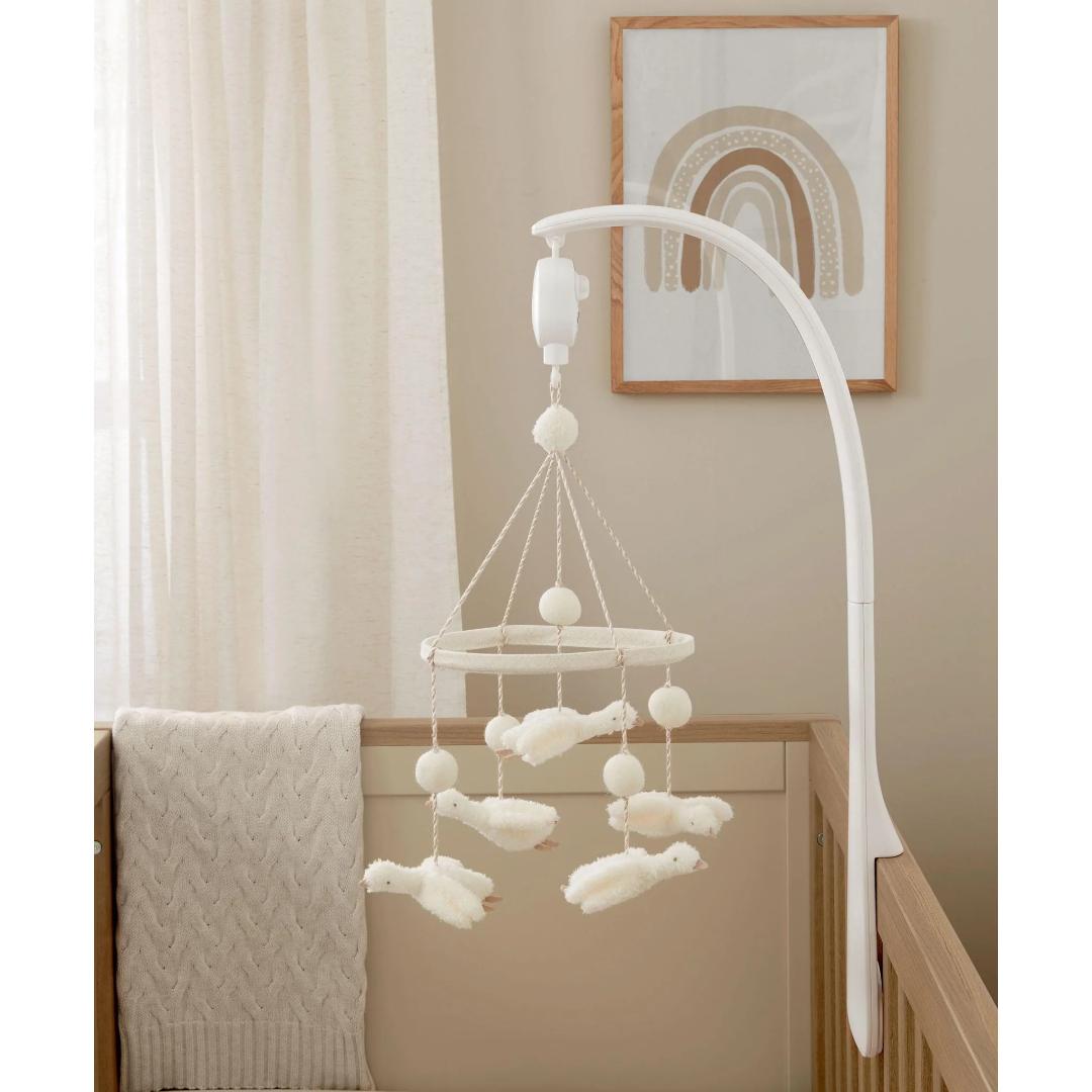 Musical mobile, with 5 plush ducklings flying! Ducklings made from soft borg fabric, with soft-toy filling. In off-white and linen colours. Finished with cloud-like Pom Pom details.