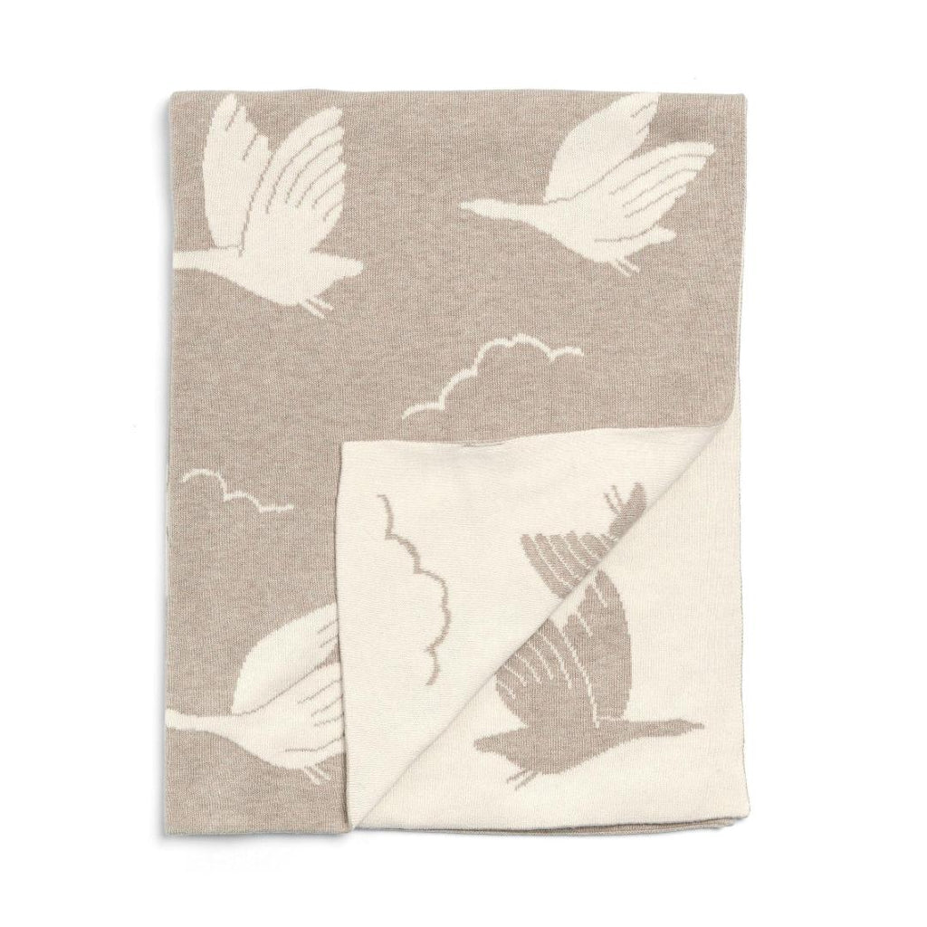 Light-weight knitted cotton blanket. In mocha brown with off-white flying duck silhouette detail. Same design with opposite colours on reverse. Made from super soft Cotton.