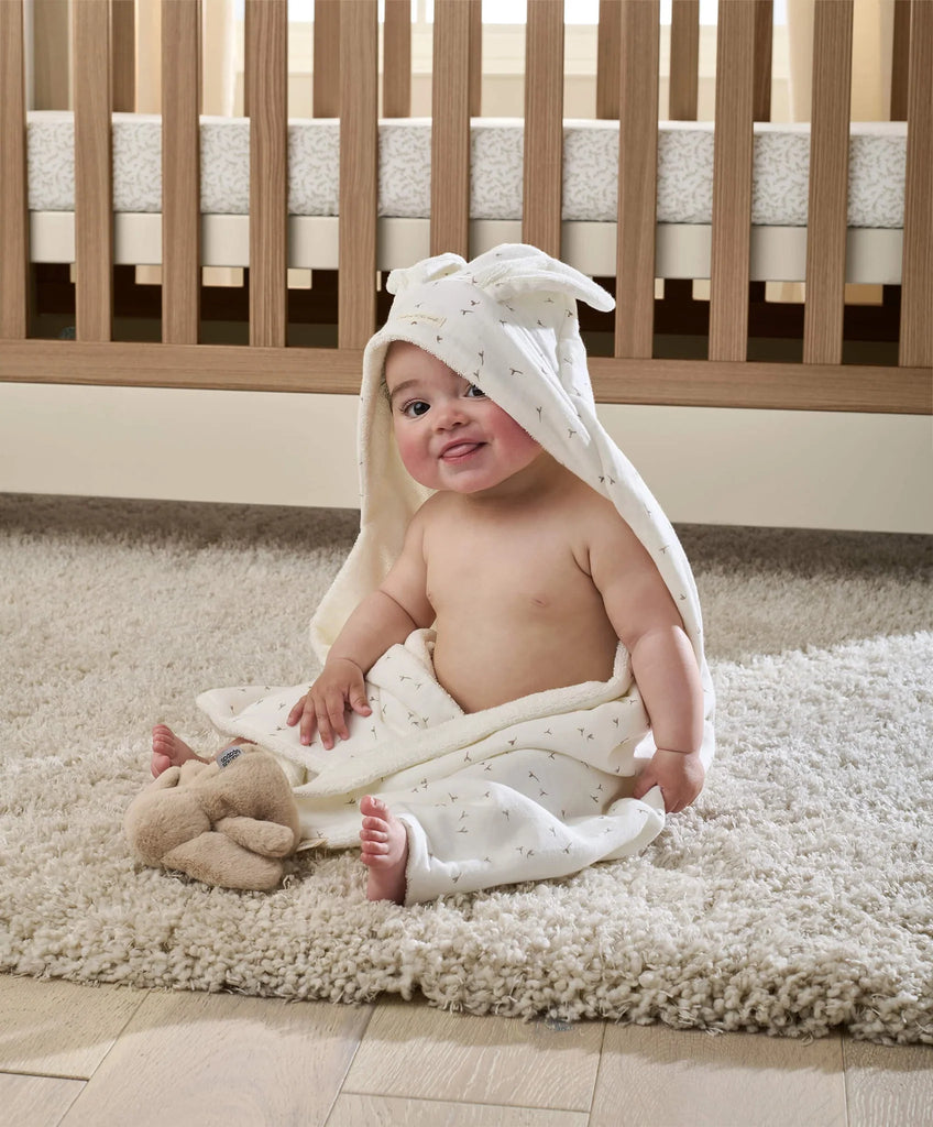 Hooded towel, made from rich soft organic cotton. Crafted from soft laundered muslin, with delicate seed print that's signature to this range. Lined with ultra-soft and absorbent towelling, made from organic cotton.