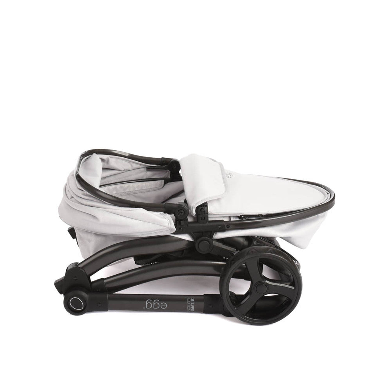 The egg® Dolls Pram also folds for storage. Simply remove the carrycot, then fold down the handle using the egg button on either side. Pull on the handle in the basket to collapse the frame.
