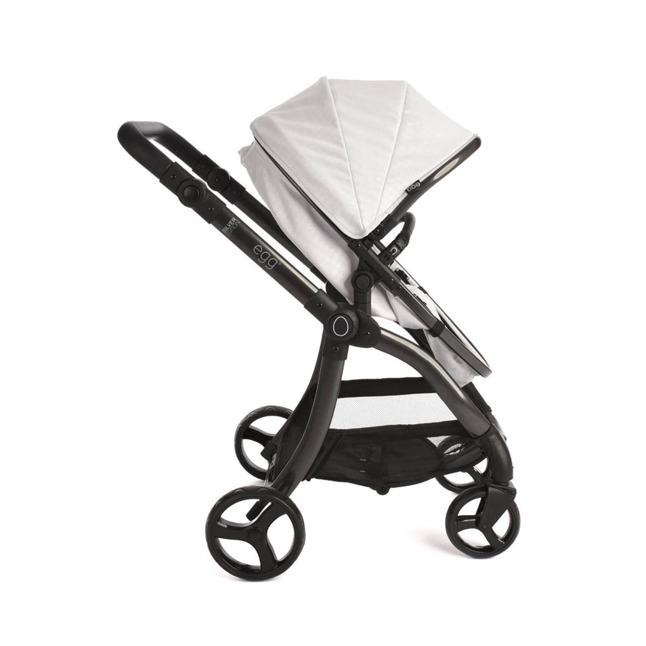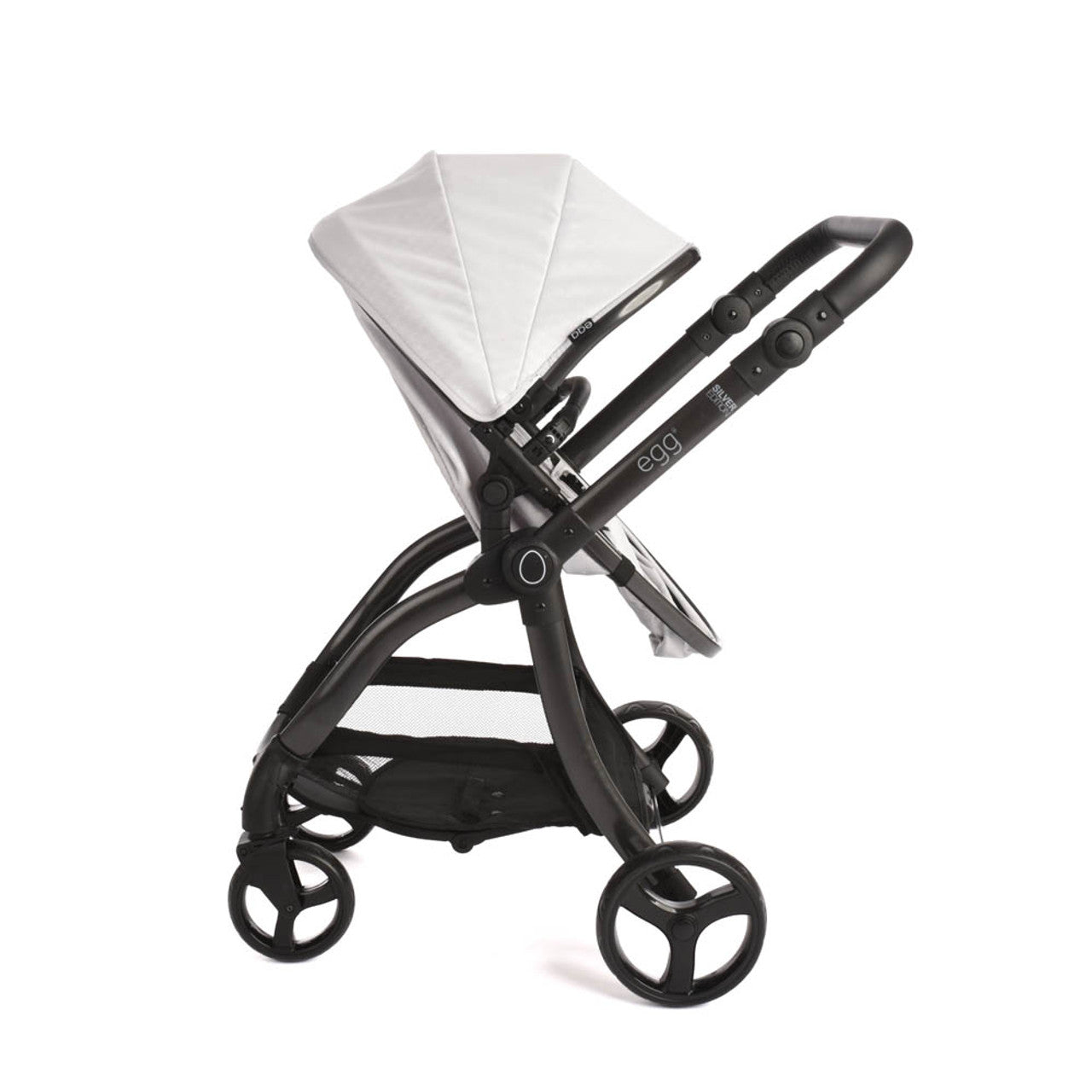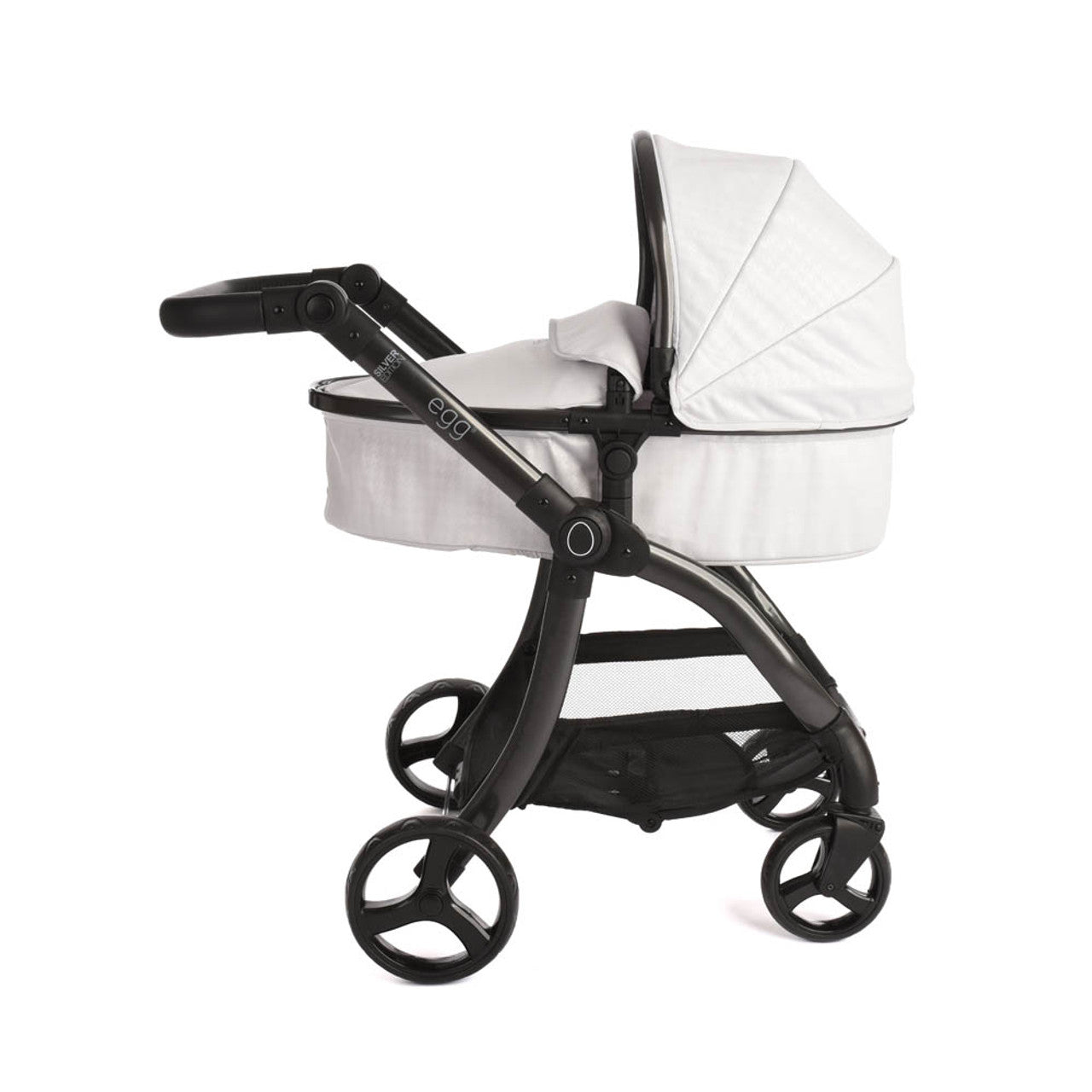 Included in the box is a coordinating apron for use in carrycot mode. The fabrics are the same stunning Feather colourway found on the full-size egg2® stroller. Finished on a gloss champagne chassis with cocoa leatherette hand-stitched handlebar.